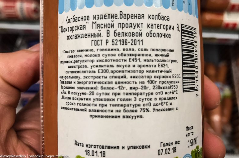 14. А вот и он. Состав. Кстати, настоящая варёная колбаса должна быть не розовая, а… серая!