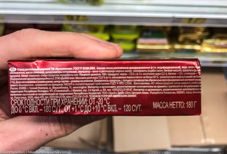 *Вот перед нами продукт с гордым названием «Кремлёвское». Но «Кремлёвское» ЧТО? Нет ответа.* — читай внимательно — спред растительно-жировой. Все честно, без обмана.