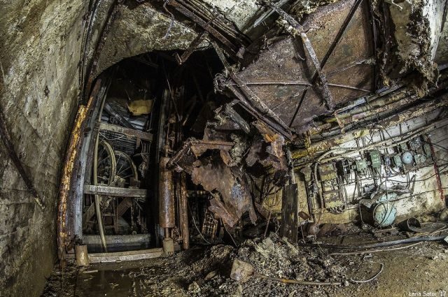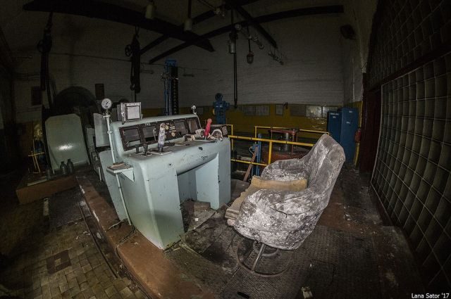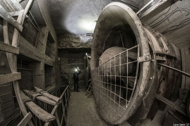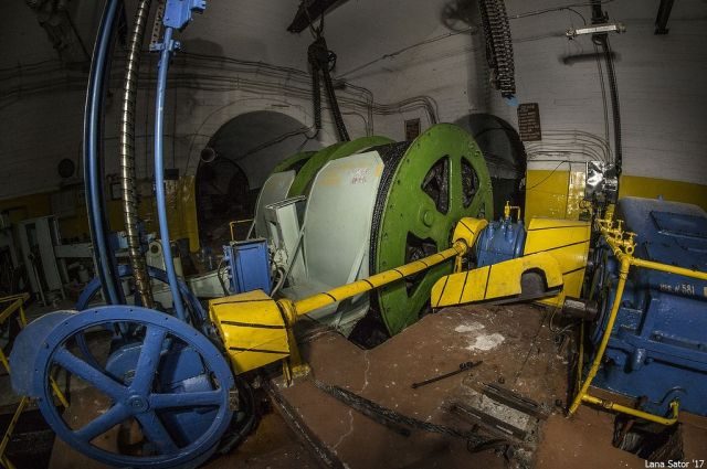 Однако, этот ствол устроен совсем не так, как первый. Возле основания размещены колёса, направляющие тросы в отходящую вбок выработку — к подземной лебёдочной, так называемой камере подъёма! Неожиданное решение, позволившее разместить лебёдочную не на поверхности, а глубоко в недрах — для возможности обслуживать ее при той самой глобальной беде на поверхности