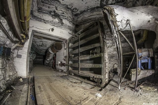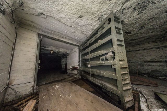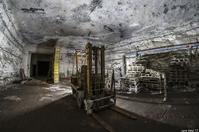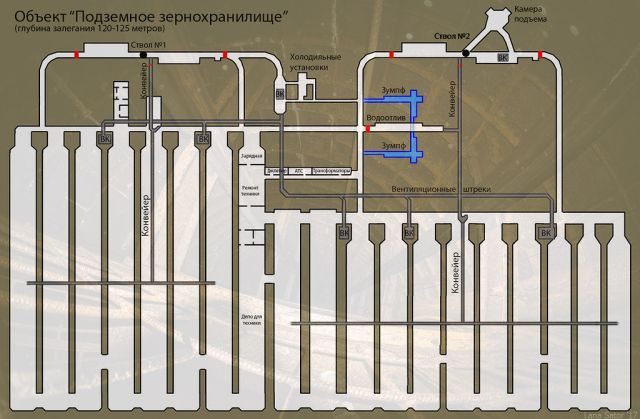 Все хранилища соединены между собой широкими коридорами. Но главные зоны выстроены в виде штреков, продолжительностью несколько сотен метров. Их высота превышала 10 м, а ширина – 8 м. над потолком – все тот же конвейер. Другие убежища оставались пустыми, иногда встречалась техника. А в местах, где конвейер выходил из потолка, располагалось оборудование, которое предназначалось для разгрузки зерна. Среди множества помещений исследователи наткнулись на туалеты. Их стены были выложены стеклянной зеленой плиточкой. Из чертежей вентиляции видно, насколько масштабный этот объект.