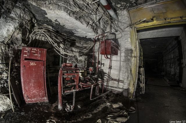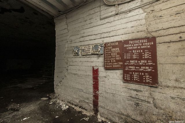 В обе стороны от ствола расходится просторная выработка, на стенах — таблички инструкций и устройства связи, подачи сигналов и управления клетью — лифтом, спускавшим и поднимавшим людей параллельно всем тем лесенкам