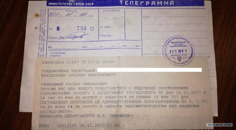 Департамент Росгидромета по ДФО подал в суд на любителя-синоптика, мотивируя отсутствием у него лицензии на работу в области гидрометеорологии. 22 января 2018 года состоялось первое заседание, на котором мужчине дали ознакомиться с делом и перенесли суд на 1 февраля.