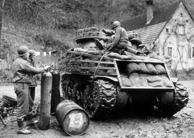 Танкисты армии США защищают свой «Шерман», 1944