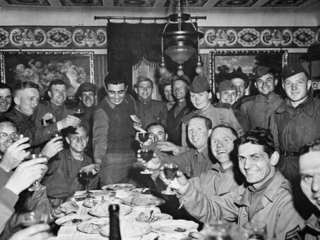 Американские и советские солдаты поднимают тост за победу над Германией. 1945