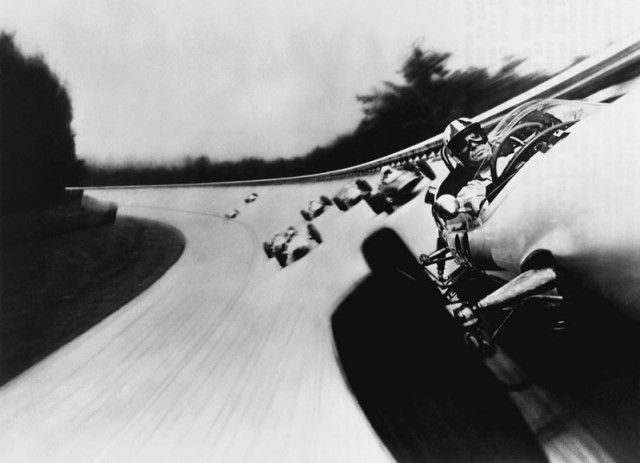Актер Джеймс Гарнер возглавляет гонку Формулы-1 на кадре из фильма 1966 года «Гран-при», первого фильма, в котором камера была установлена на гоночном болиде, чтобы передать захватывающую скорость и азарт гонки.