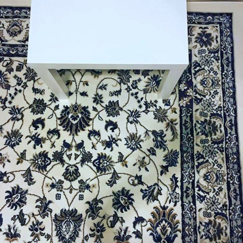 Чехол телефона сливается с рисунком ковра. Он находится справа, возле одной из ножек стола.