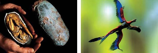 В том же районе Китая позднее обнаружили остатки трех видов динозавров возрастом 120 миллионов лет — протархеоптерикса (возможного предка археоптерикса), каудиптерикса (существа, покрытого перьями, правда, более короткими и симметричными, чем это нужно для настоящего полета) и синозавроптерикса (животного размером с курицу, покрытого примитивными нитевидными перьями). Последний был фактически переходной формой от птицеподобных динозавров к динозавроподобным птицам.