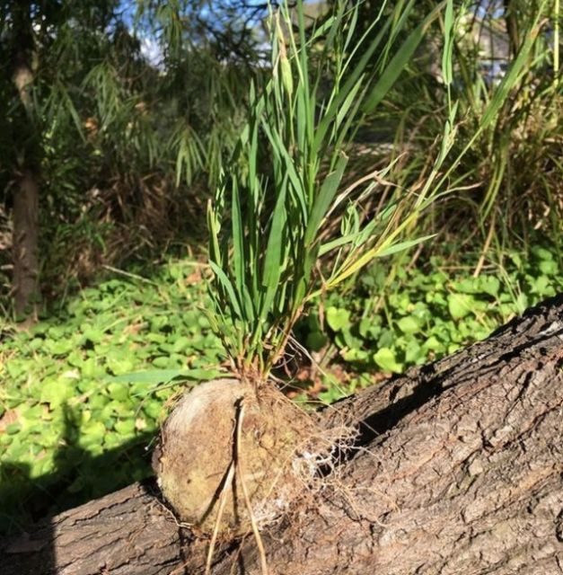 Трава проросла через старый теннисный мяч, оказавшийся в земле.