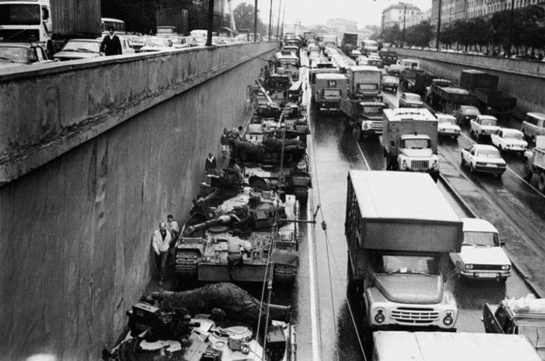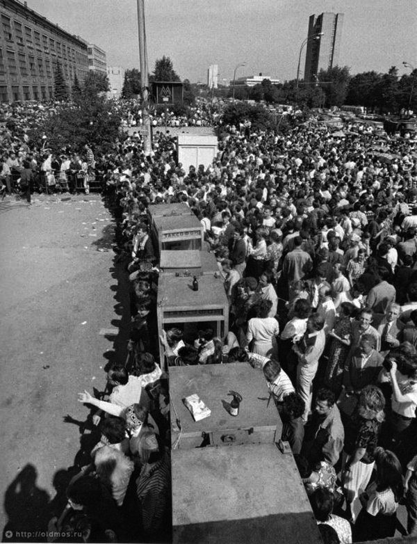 1991. Улица Чайковского (сейчас Новинский бульвар). В Москву было введено около четырех тысяч военнослужащих, 362 танка, 427 бронетранспортёров и БМП. В первый же день части Таманской дивизии перешли на сторону защитников Белого дома.