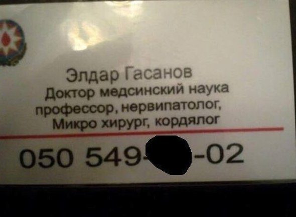 У Элдара Гасанова слово «профессор» написано без ошибок. Поэтому этот специалист сразу вызывает желание прооперироваться у него.