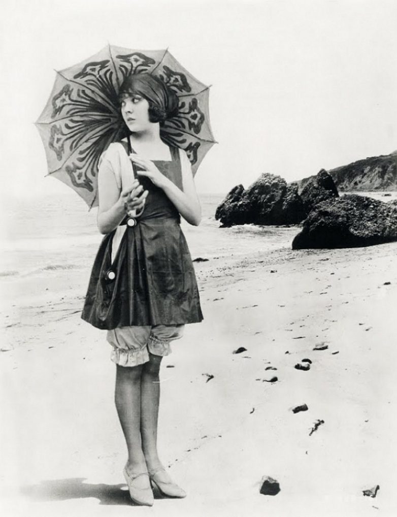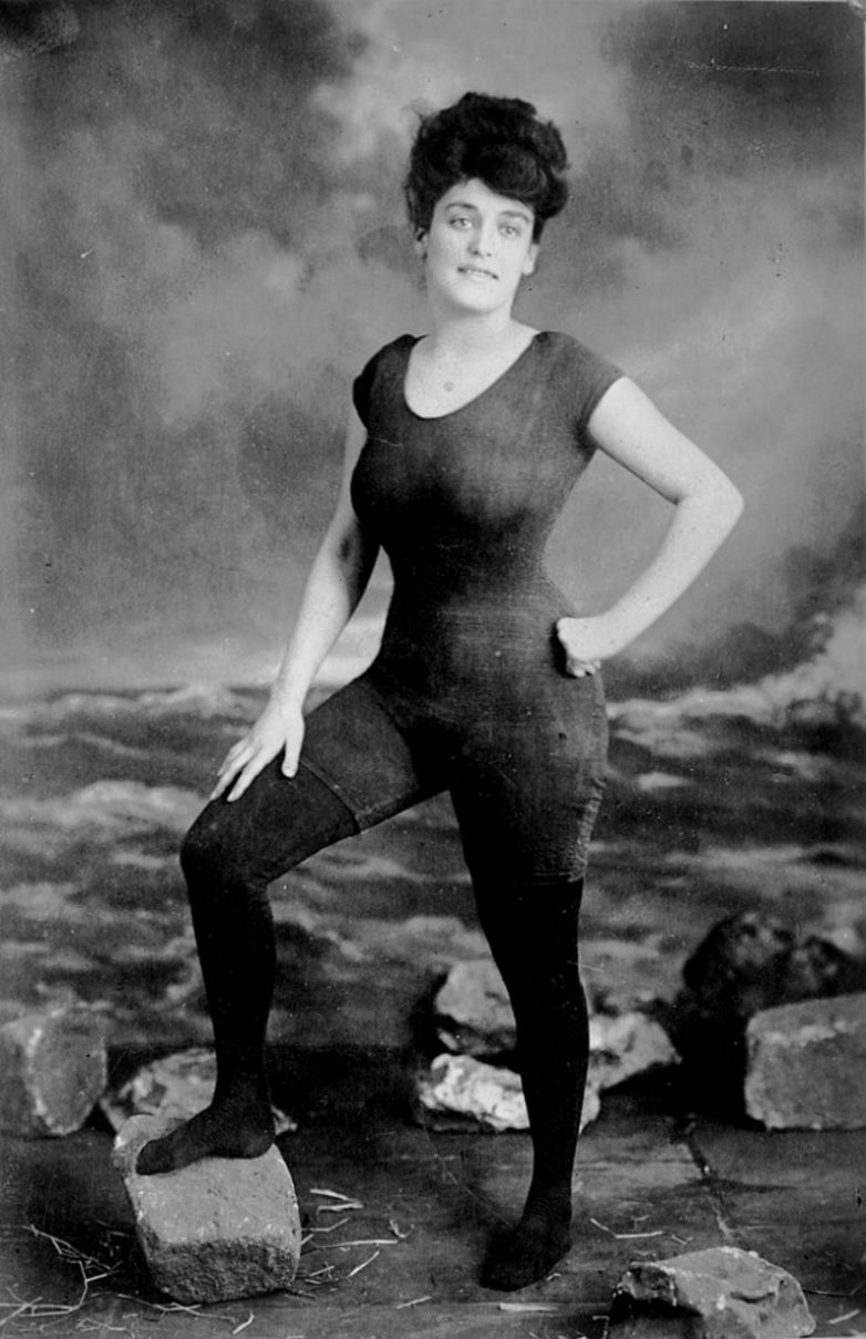 Аннет Келерман — профессиональная пловчиха, актриса и модель позирует в купальнике, за что ее позже обвинят в неприличии, 1907 год