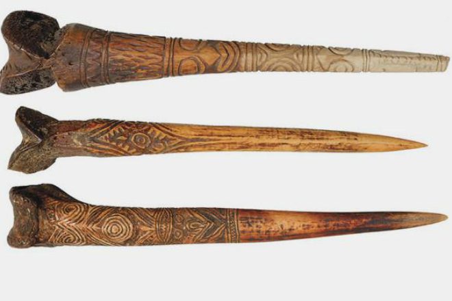 Сверху кинжалы из человеческой кости, под ним — из кости казуара