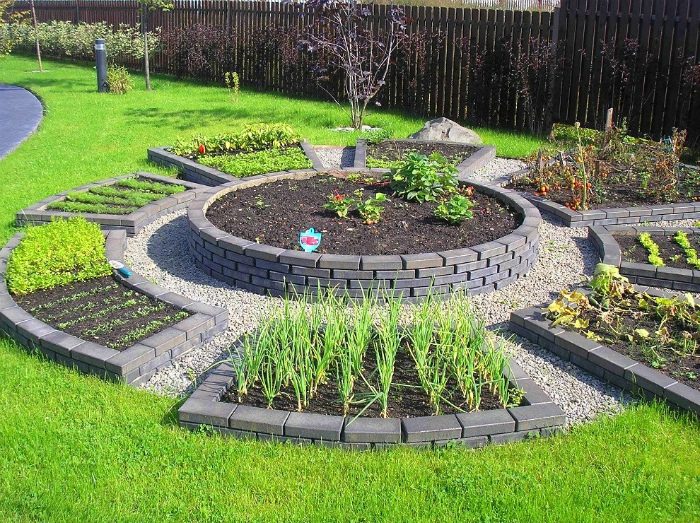 Стильная композиция из приподнятых грядок, огражденных серым кирпичом, станет гармоничным украшением современного огорода.