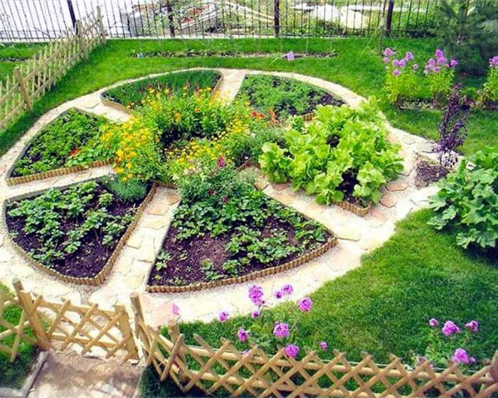 Оригинальная композиция с цветами в середине и приподнятыми овощными грядками, огражденными невысокими бортиками, поставленными в виде лучей.