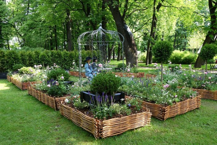 Чудесные высокие грядки квадратной формы, огражденные милыми плетеными заборчиками, прекрасно подойдут для выращивания цветов и значительно улучшать внешний вид садового участка.