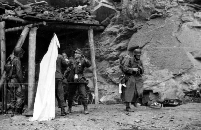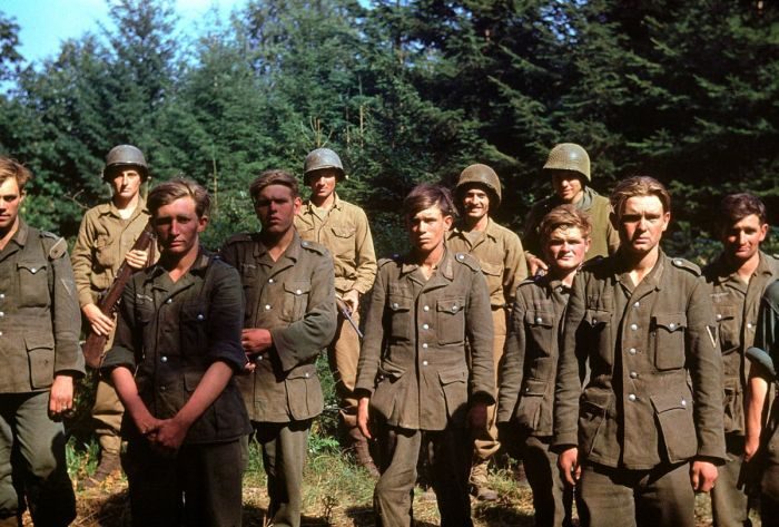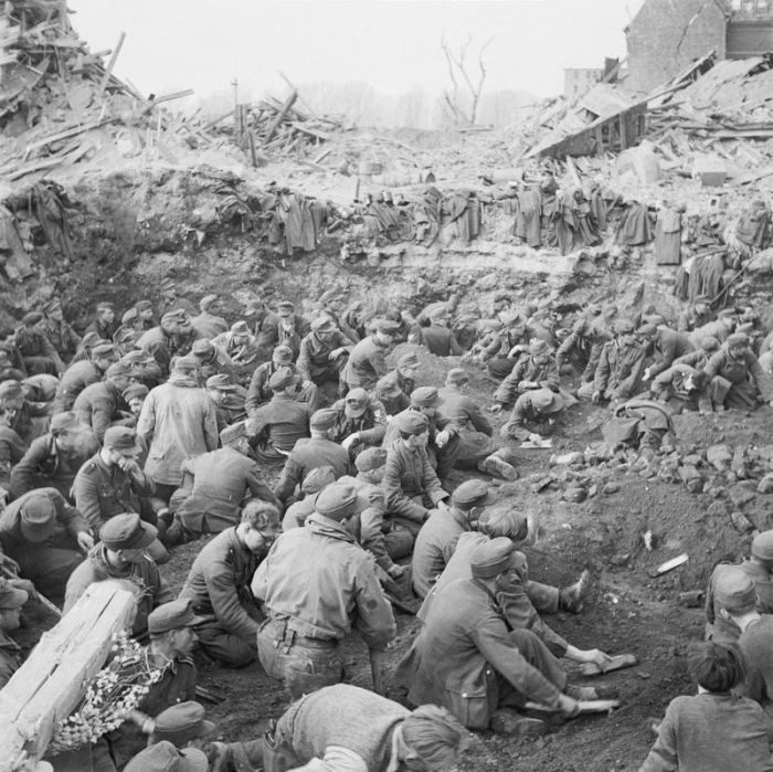 На этих исторических кадрах запечатлены немецкие солдаты и офицеры, которые массово сдаются в плен, когда от былого величия Третьего рейха не осталось и следа.