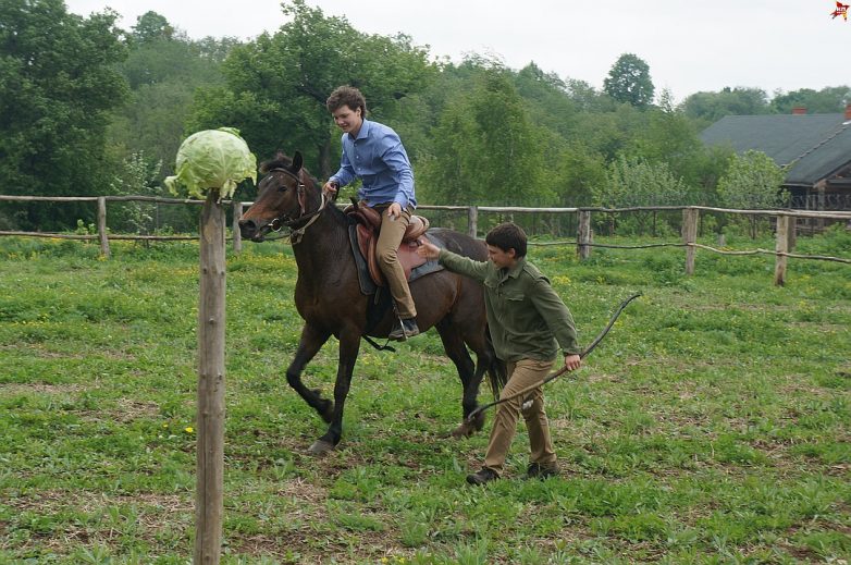 Вот по полю на коне скачет молодой богатырь в голубой рубашке – сын Стерлигова. На ходу крутит шашкой — разлетаются в разные стороны раскроенные головешки капусты. Потом в ход пошли метательные топоры, затем — лук со стрелами…