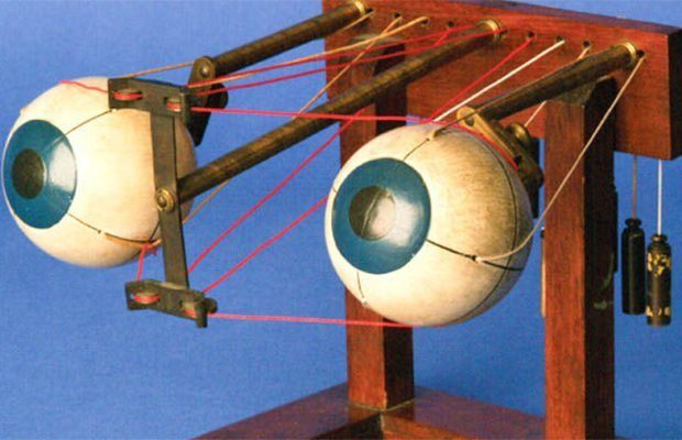 Это модель человеческих глаз. Специальные шары приводились в движение нитями, которые символизировали мышцы человеческого лица. Таким образом наглядно демонстрировалось вращение глазного яблока человека.
