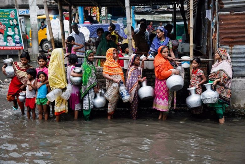 Женщины ждут чистую воду во время наводнения в Дакке