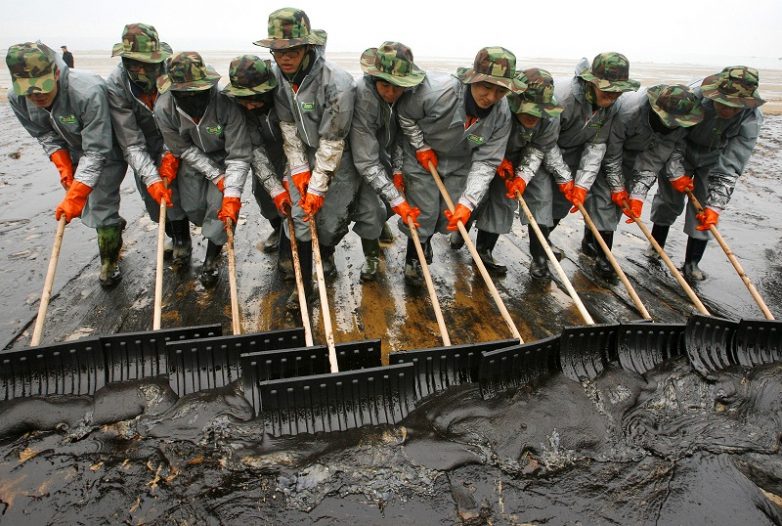 Южнокорейские солдаты очищают пляж от нефти после крушения танкера