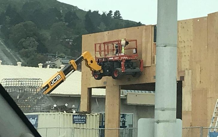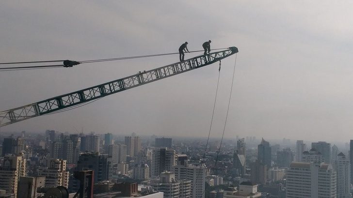 Фото сделано с 33-го этажа. Парни работают без какой-либо страховки