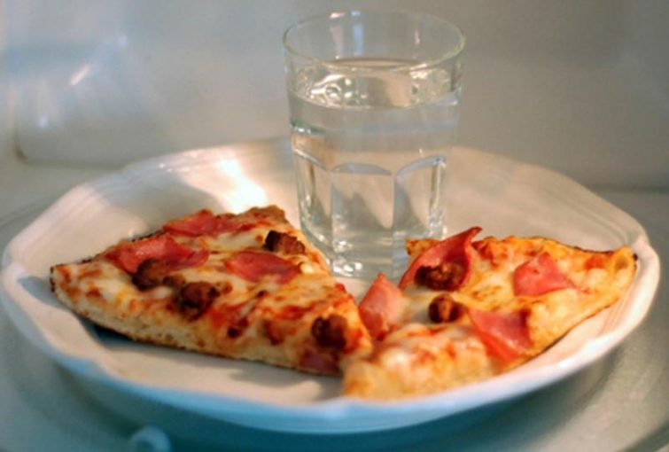 Разогревая остатки пиццы в микроволновке, поставьте в центр блюда небольшой стаканчик с водой. Эта хитрость позволит предотвратить появление сухой корки.