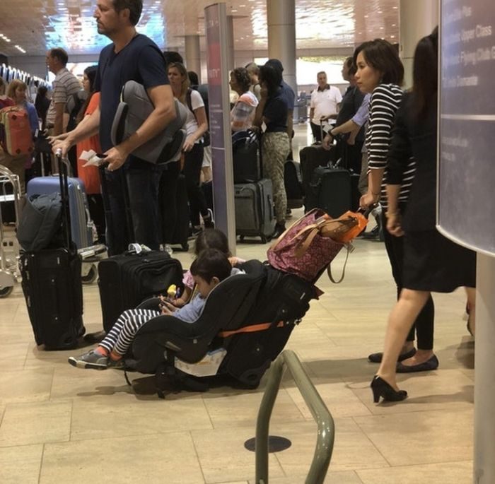 Детское кресло не придется носить в руках, если прикрепить его к чемодану.