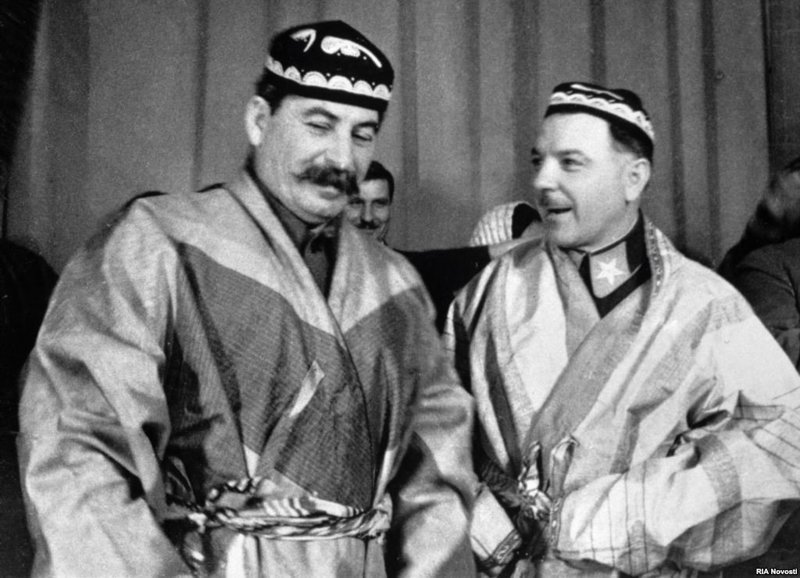 Сталин и Ворошилов в тех самых узбекских халатах и тюбетейках