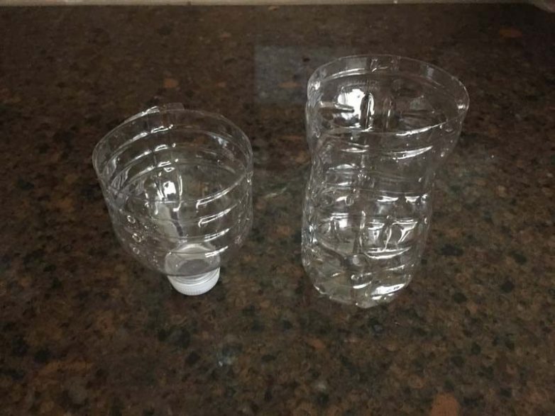 Первое, что мы делаем, это разрезаем нашу бутылку на 2 части, одна из которых, та, которая с крышкой, поменьше, а вторая — побольше (смотрите фото). Для этого процесса используем ножницы или нож (или то и другое )
