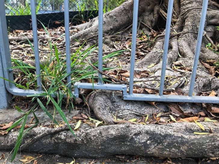 Вместо того чтобы спилить корень, под него сделали специальную выемку в заборе