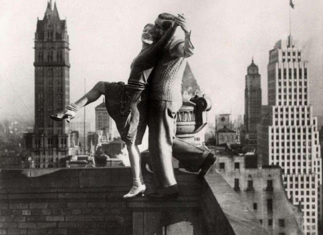 Пара танцует на уступе небоскреба на высоте 650 футов (200 метров), Нью-Йорк, 1931 год.