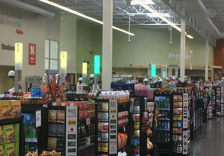 Подсветка касс в супермаркете: зеленый — касса свободна, желтый — очередь 1–2 человека, оранжевый — 3 покупателя и больше