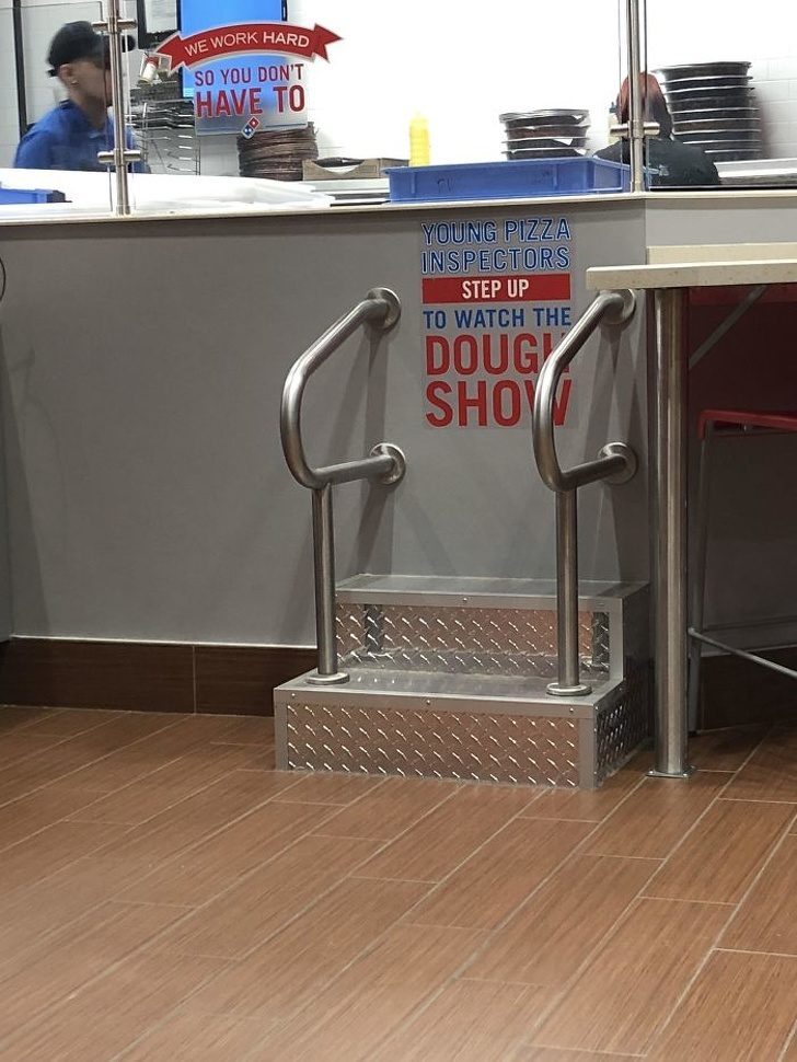 В этой пиццерии есть специальные ступеньки, чтобы дети могли посмотреть, как готовится пицца «Для юных инспекторов пиццы. Поднимитесь, чтобы увидеть тесто-шоу».