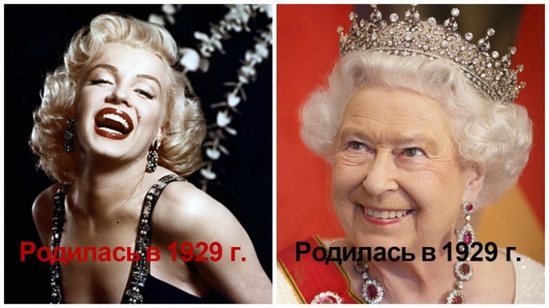 3. Мэрилин Монро и королева Елизавета родились в одном и том же году. На снимке обеим по 30 лет. Лондон, октябрь 1956 г.