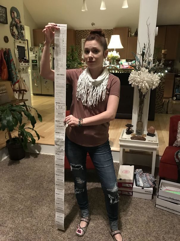 10. «Длина моего чека за покупку всего лишь бутылки масла. Рядом собака для сравнения»