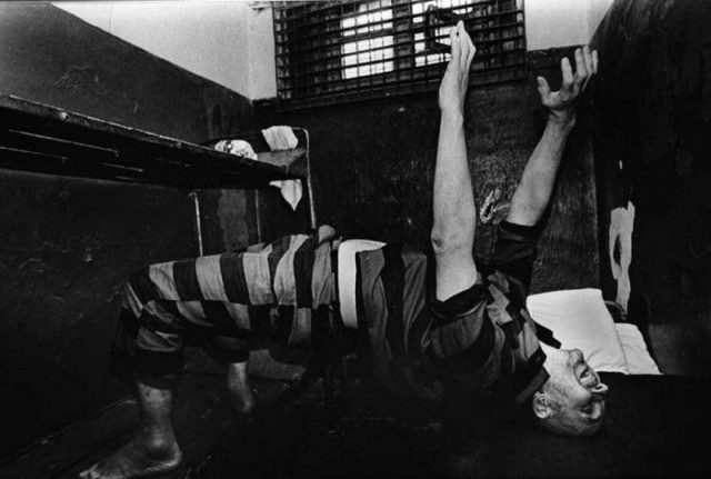 Маньяк Андрей Чикатило перед расстрелом в камере занимается йогой, 1993 год.