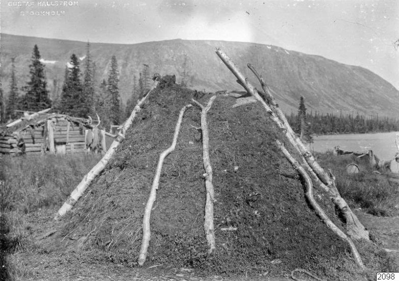 Вот это не знаю что такое. Дом, шалаш, склад? Похоже одновременно и на шалаш, и на юрту — но при этом у неё есть небольшая дощатая дверь. Справа стоят деревянные сани.