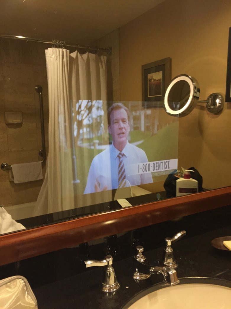 Телевизор, встроенный в зеркало в ванной одного из отелей