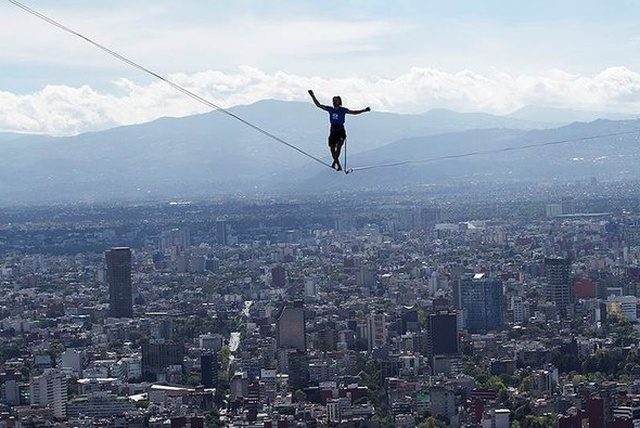 Канатоходец Александр Шультц прошёл по канату, натянутому между двумя небоскрёбами в Мехико