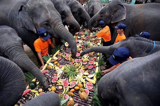 Сотрудники лагеря Winga Baw вместе со своими подопечными отмечают Всемирный день слонов. Баго, Мьянма