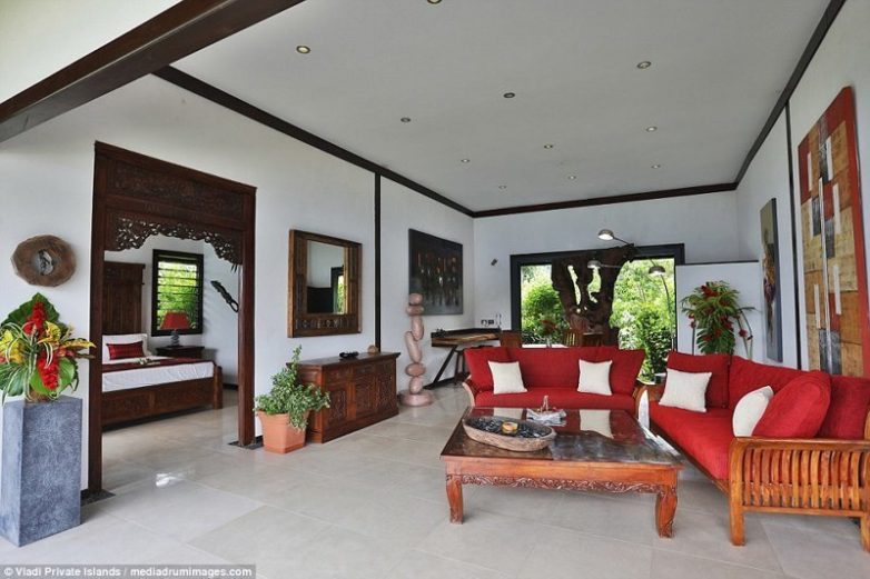 Жилая зона: плюшевые диваны, декор в природном стиле и прекрасный вид из окна на зеленую часть острова