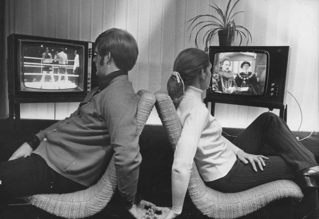 Семейная пара из Миддлсекса арендуют второй телевизор, чтобы одновременно смотреть боксерский поединок Генри Купера против Джо Бугнера на BBC1 и историческую драму «Элизабет Р» на BBC2.