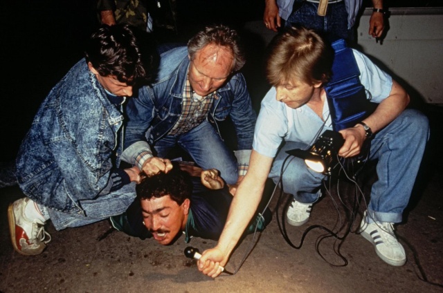 Репортер берет интервью во время задержания члена этнической мафии. Россия, Москва, октябрь 1991 года.