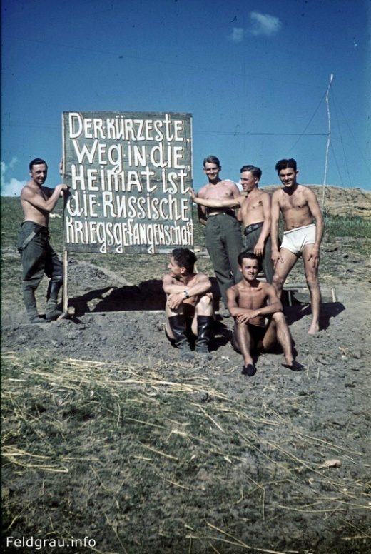 Немецкие солдаты у советского агитационного плаката «Кратчайший путь на родину — это русский плен». Автор снимка — Франц Грассер, дата — июль 1943 года.