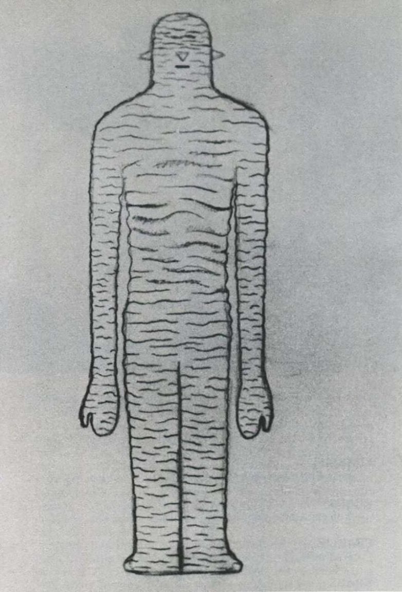 На одной из рукописных страниц доктор Хардер написал: «Я спросил, как выглядели «существа», и получил описание, которое включало: 1. У них нет шеи, нет шлема. 2. Крабовидные руки, двухпалые… 3. Щелевидный «рот».».