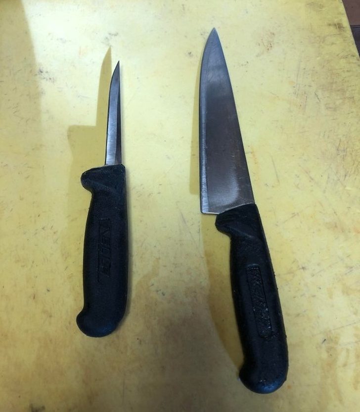 Нож слева когда-то был точно таким же, как нож справа, но годы непрерывного использования профессиональным поваром сделали свое дело