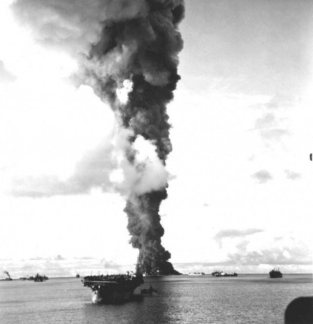 Горящий танкер USS Mississinewa после попадания первой японской управляемой торпеды. Погибло 63 члена экипажа. 20 ноября 1944