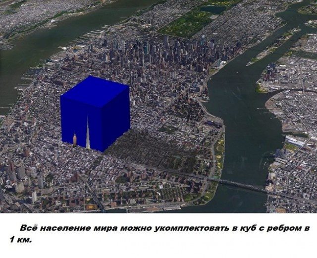 В куб с ребром 1 км в виде фарша войдет вдвое больше людей, чем сегодня живет на Земле. А если всех людей утопить, например, в Ладожском озере, то его уровень повысится всего на 3 см. Нас не так уж и много по объему, поэтому нужно беречь друг друга.