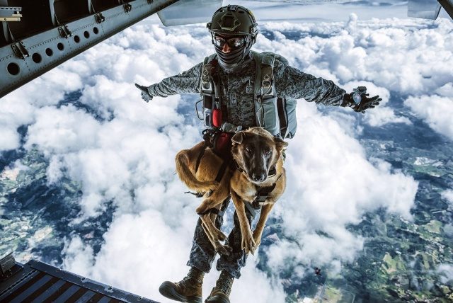 Служащий колумбийских ВВС выполняет тренировочный прыжок с собакой.