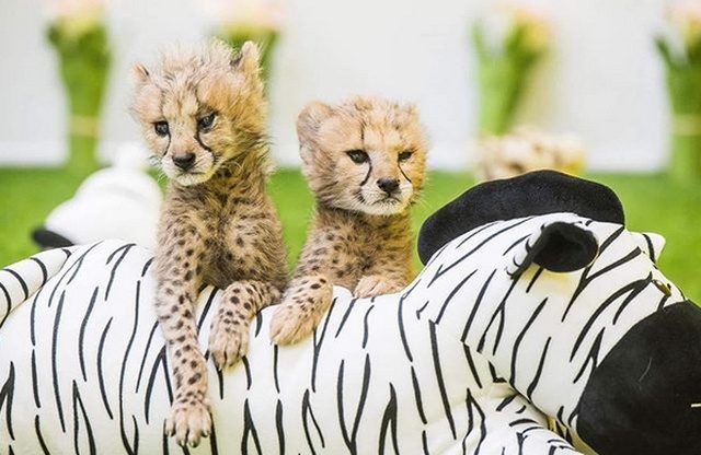 Маленькие гепарды, рождённые в марте, сидят на игрушечной зебре. Парк Эверленд, Йонгин, Южная Корея